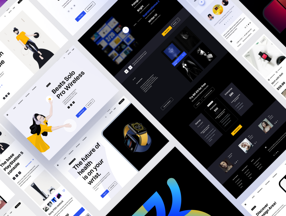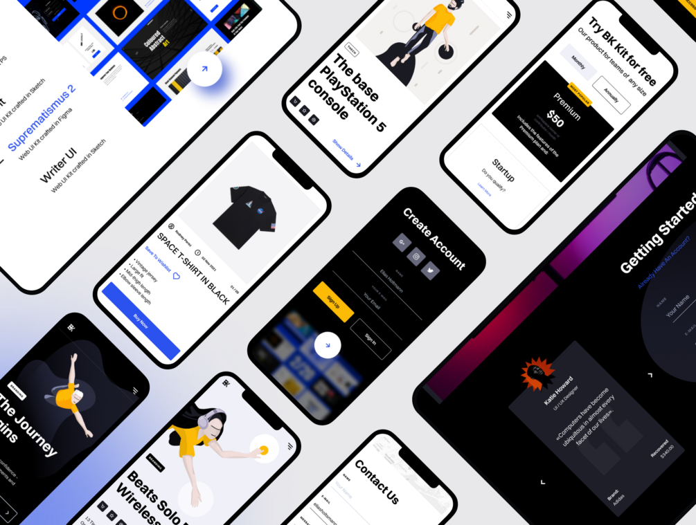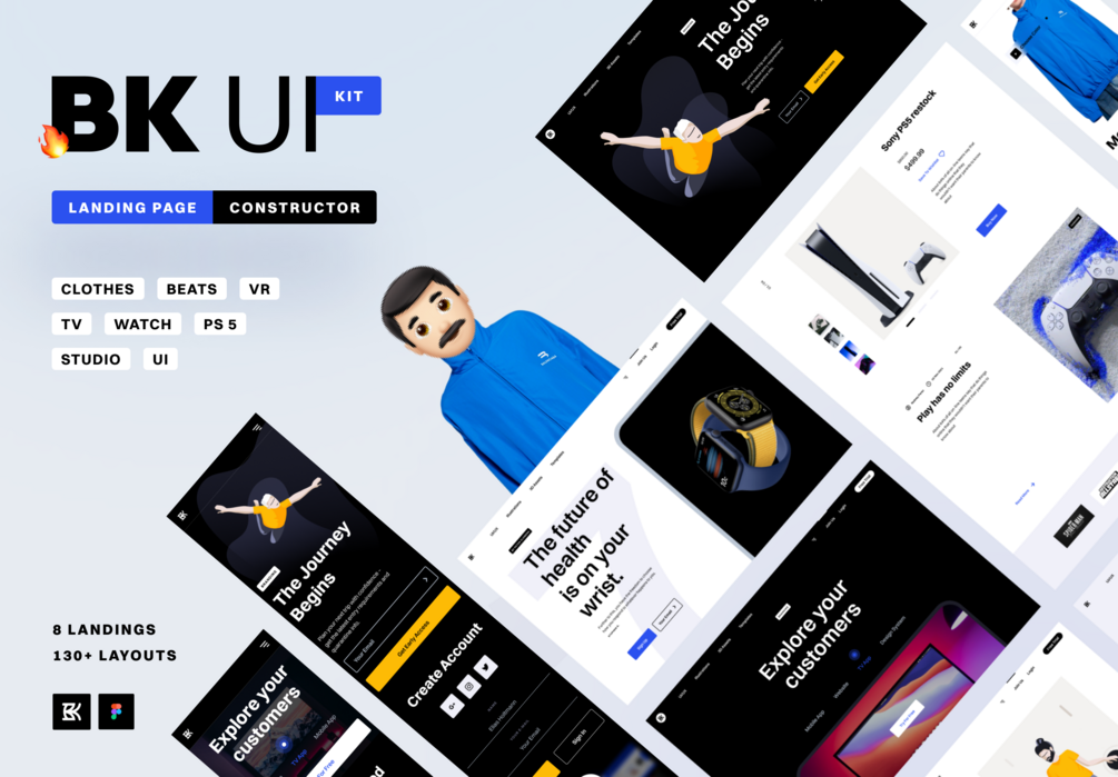Eight Full adaptive landing pages. It works like constructor. You can quick change structure of every layout, use your product image and add text. Every view (desktop, tablet, mobile) has general components for create beautiful and professional landing page. Test your ideas right now with BK ui kit 😎